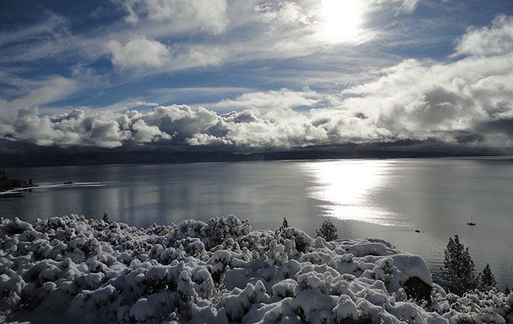 One of the most amazing transformations to witness is a snow storm moving across Lake Tahoe. Clouds become caught over the high peaks of Desolation Wilderness as if the earth-trapped granite reaches up to catch ethereal life-giving sails that remain far too elusive during summer. After some time, storm clouds break free of the mountains' grasp and surge over the lake toward the east shore's massive towers before dissipating over The Great Basin. This tumultuous journey is a beautiful one to watch.: