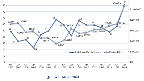 In the first quarter of 2021, we saw the continued impact of the pandemic on Tahoe’s real estate market. As we saw throughout 2020, the appeal of Lake Tahoe, as a convenient escape from urban centers, drove increased demand. The demand continued to exceed supply, triggering a flurry of buying activity that resulted in a spike in median price. All micro-regions, with the exception of lakefronts, saw unprecedented increases in both the number of homes sold and median price, reaching historic highs. The Tahoe Sierra MLS saw a 37% increase in sales volume of single-family homes year over year alongside a 59% increase in median price. Incline Village & Crystal Bay saw a 75% increase in sales volume alongside an 83% increase in median price year over year. For the first time in history, all micro-regions now show the median price of single-family homes over $1M. And, the percentage of homes that sold over $2M reached an all-time high. Seven single-family lakefront homes between Incline Village & Rubicon Bay sold in Q1, a high-mark that was matched in both 2006 and 2014. The median price of lakefronts decreased 33% year over year, however due to the small sample size, that decrease does not directly correlate to market depreciation, supported by the $31M lakefront sale in Q1 noted as the highest California-side lakefront sale in two years and the $31.5M lakefront sale in Incline Village. Given the current pace, it is foreseeable that the market remains strong through 2021, and as COVID threats subside and cities begin to reopen, we may see the state of the market level out in 2022.