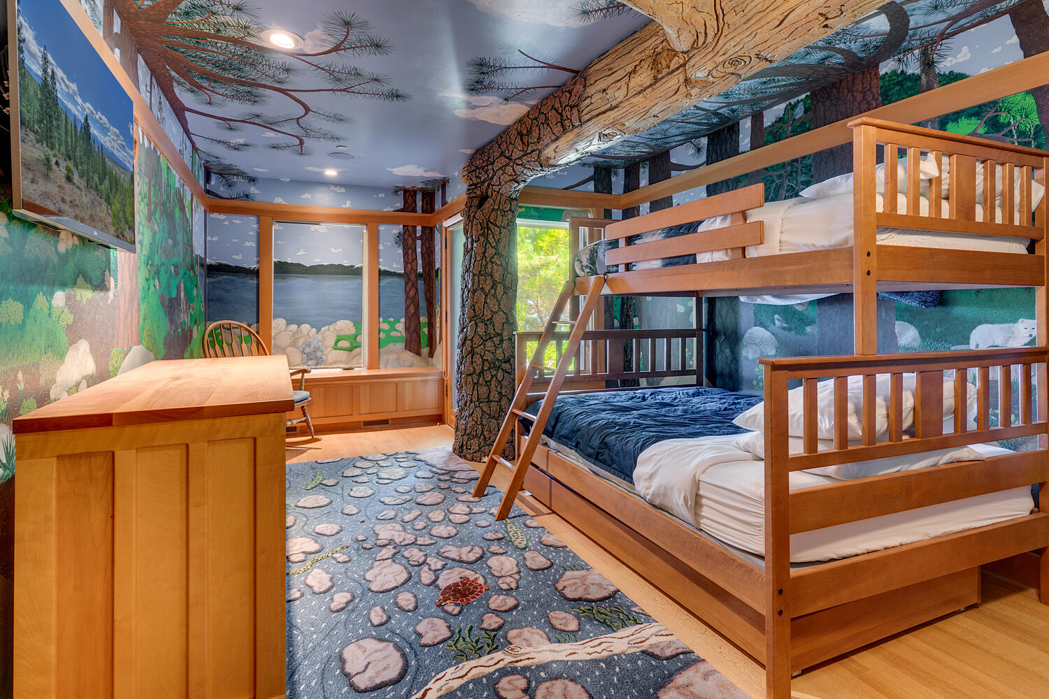Kids will love the bunk room with murals that include glow in the dark skyscape and carpet custom designed to seamlessly match the murals.