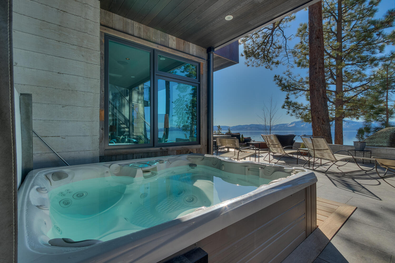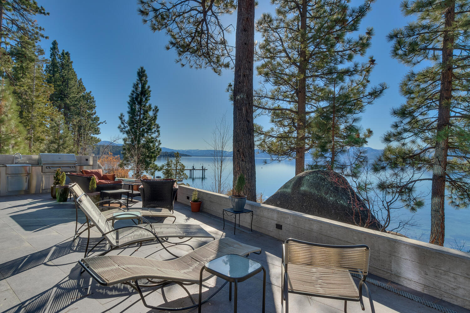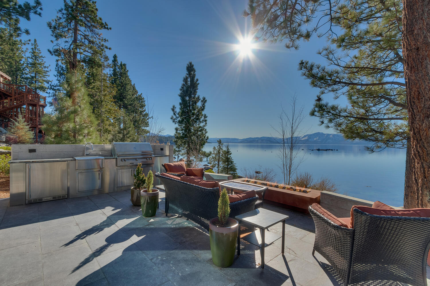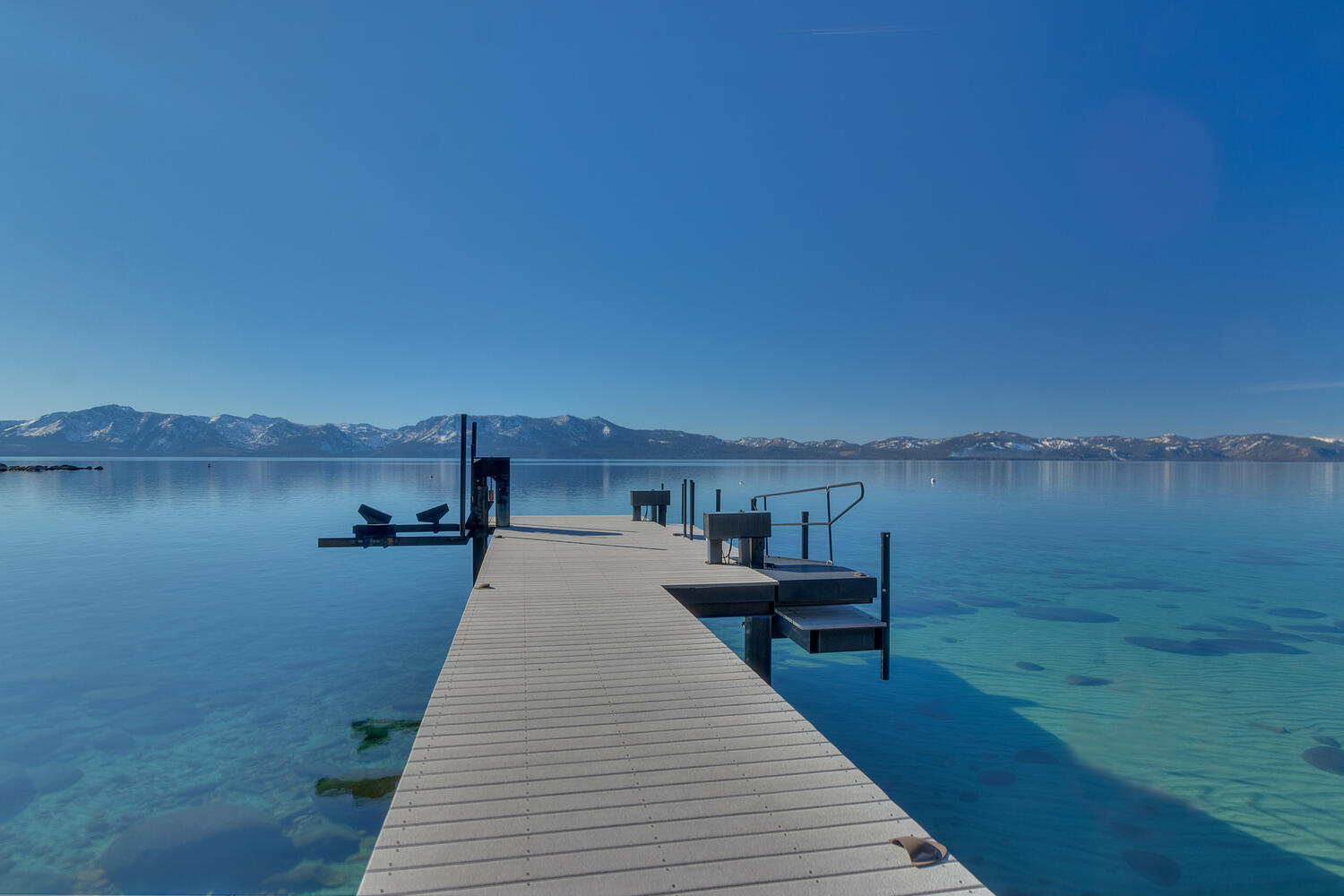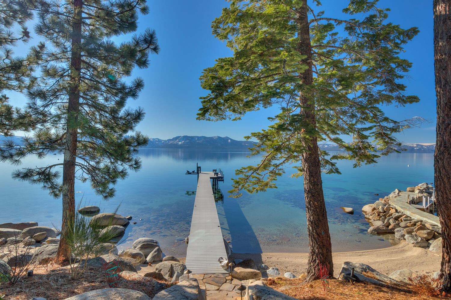 Step outside to the private sandy beach, or head out onto Lake Tahoe from the private pier with an adjustable lower landing, boat hoist and two buoys. Return home to enjoy the lush outdoor setting. Entertain on the patio with a complete kitchen (built-in barbecue, sink, fridge and storage), gather around the gas firepit, and soak in the hot tub under starry skies. Or, simply find serenity in the sitting areas of the garden.
