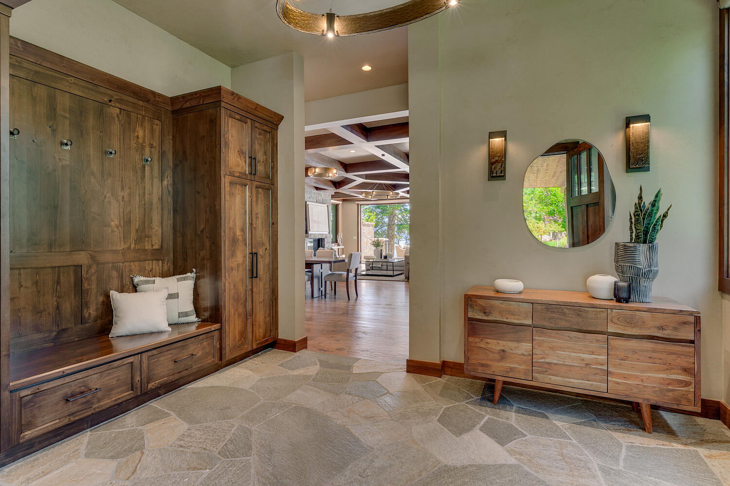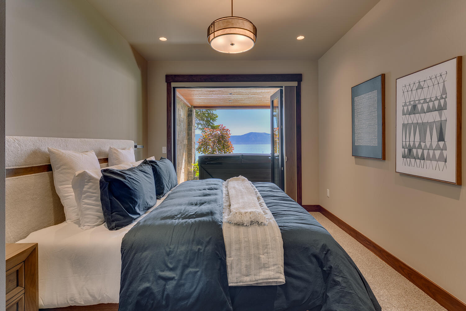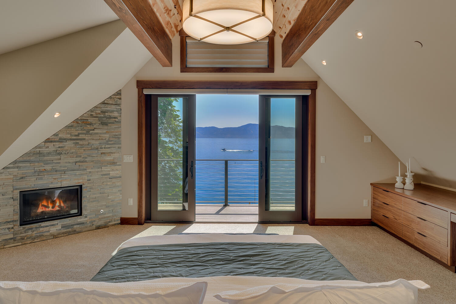 Convenient luxuries abound. The kitchen features top-of-the-line appliances, a built-in espresso machine and a pantry for additional storage. The primary suite includes a private lakefront balcony, oversized soak tub and steam shower. The mudroom storage lockers keep the entranceway orderly. Two laundry rooms minimize the hassle of cleaning. Outside, heat lamps are built-in to the lower deck, ensuring evenings in the hot tub are cozy.
