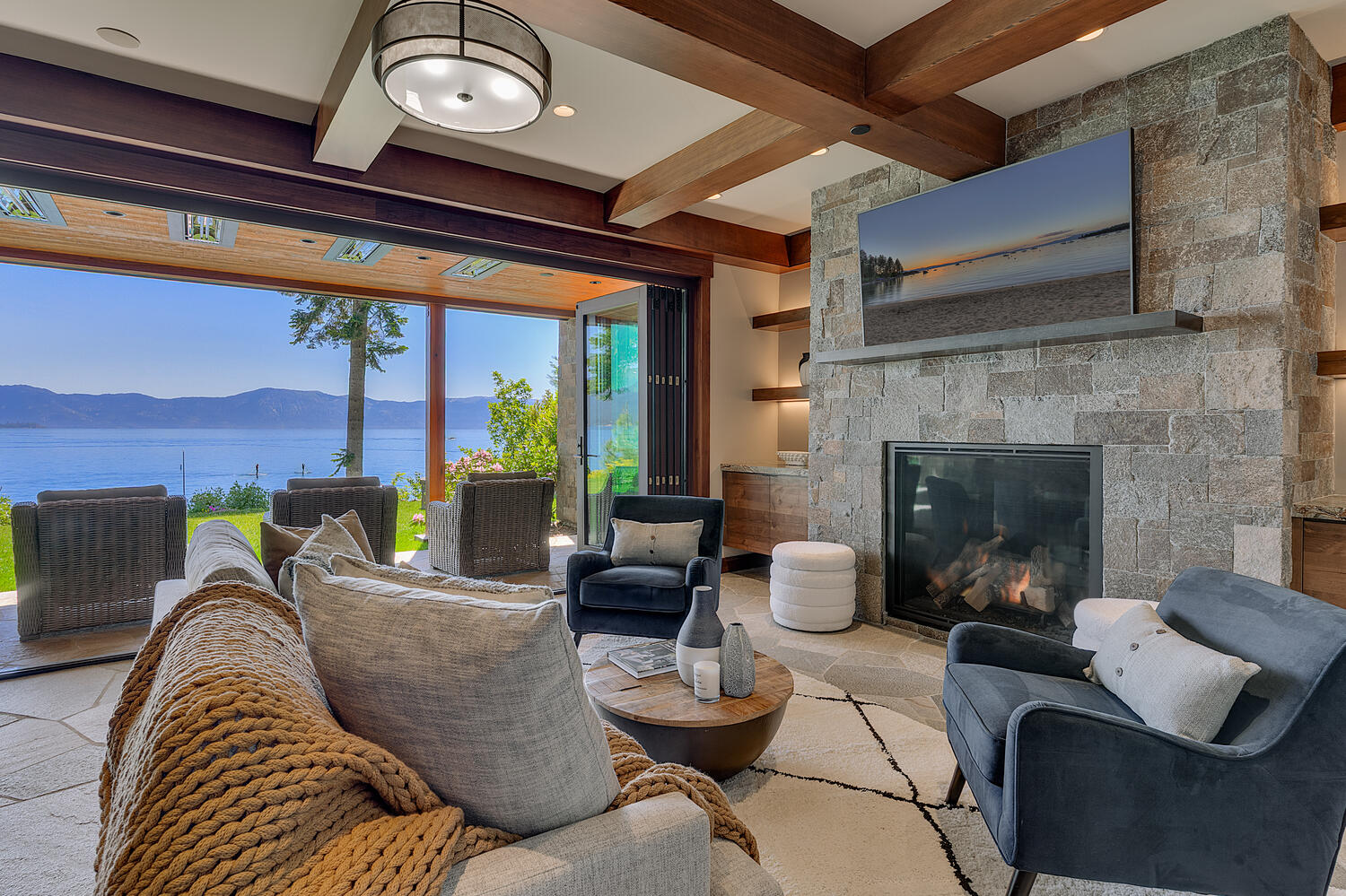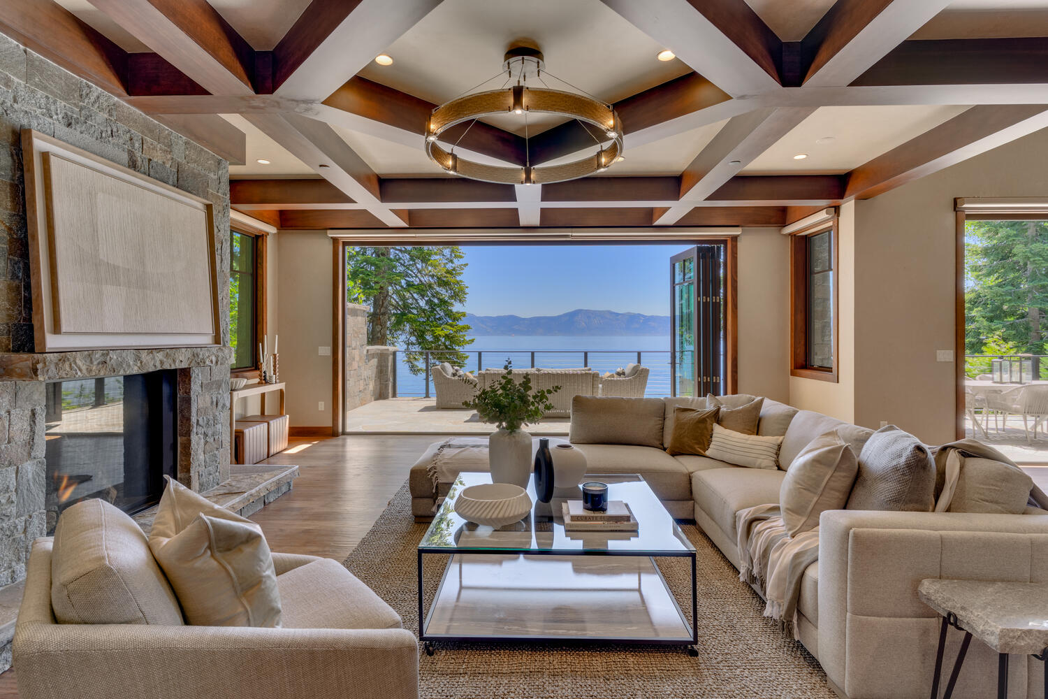 Completed in 2020, this gated and fenced North Shore lakefront estate, in the charming Cedar Flat neighborhood, is truly an architectural masterpiece. Fine craftsmanship, custom finishes, unique textures, striking fixtures and flawless design are all set against the backdrop of Lake Tahoe. Five accordion walls slide away creating seamless indoor outdoor flow, allowing you to immerse yourself in breathtaking views.