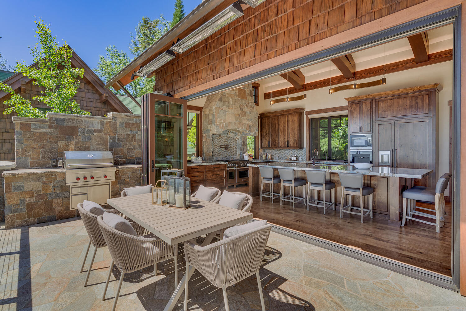 Understated elegance meets modern design, featuring custom stone work, intricate mosaic tiles and a gorgeous selection of varying stone countertops, accented by exquisitely crafted beams and warm wood tones. Rustic knotty walnut doors complement character hickory floors. The Roma blue quartzite kitchen island countertop pops with chic contemporary grace. A backlit geode bar, which includes a built-in wine tap system, exudes refined celebration. A stone accent wall on the patio and the custom stone oven hood evoke the grandeur of stately European beauty with timeless sophistication.