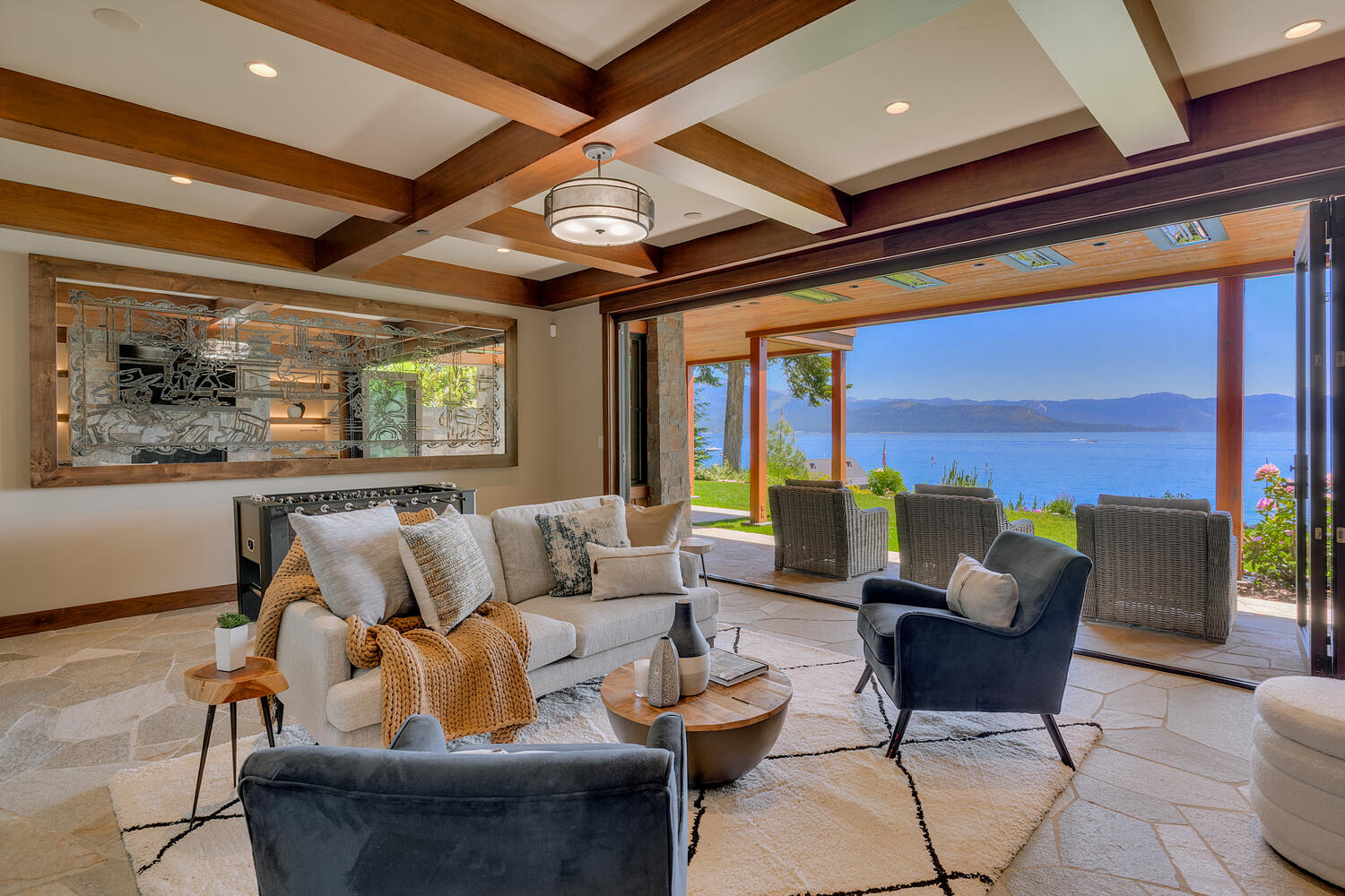 Five deluxe bedroom suites offer privacy, while common areas are designed to gather. The kitchen island seats seven comfortably. The living and dining area create a open and inviting space. The lower level includes a den with theater seating, a wet bar, and a game room that opens to the lakefront patio.