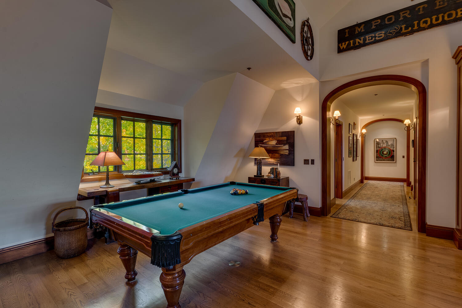 Outdoor amenities abound with a private deep-water pier and two buoys, plus 130' of lake frontage. Days on Lake Tahoe are just steps away. A true family retreat, activities are endless back at home. The backyard converts to a pro-size volleyball and badminton court. A nature path through the grounds doubles as an extreme croquet course. An in-ground bocce court is tucked within the lush forested setting, alongside a horseshoe pit. And the courtyard, protected from any prevailing wind, is the ideal spot for the basketball hoop. Annual family Olympics have been a long-time tradition at this estate.