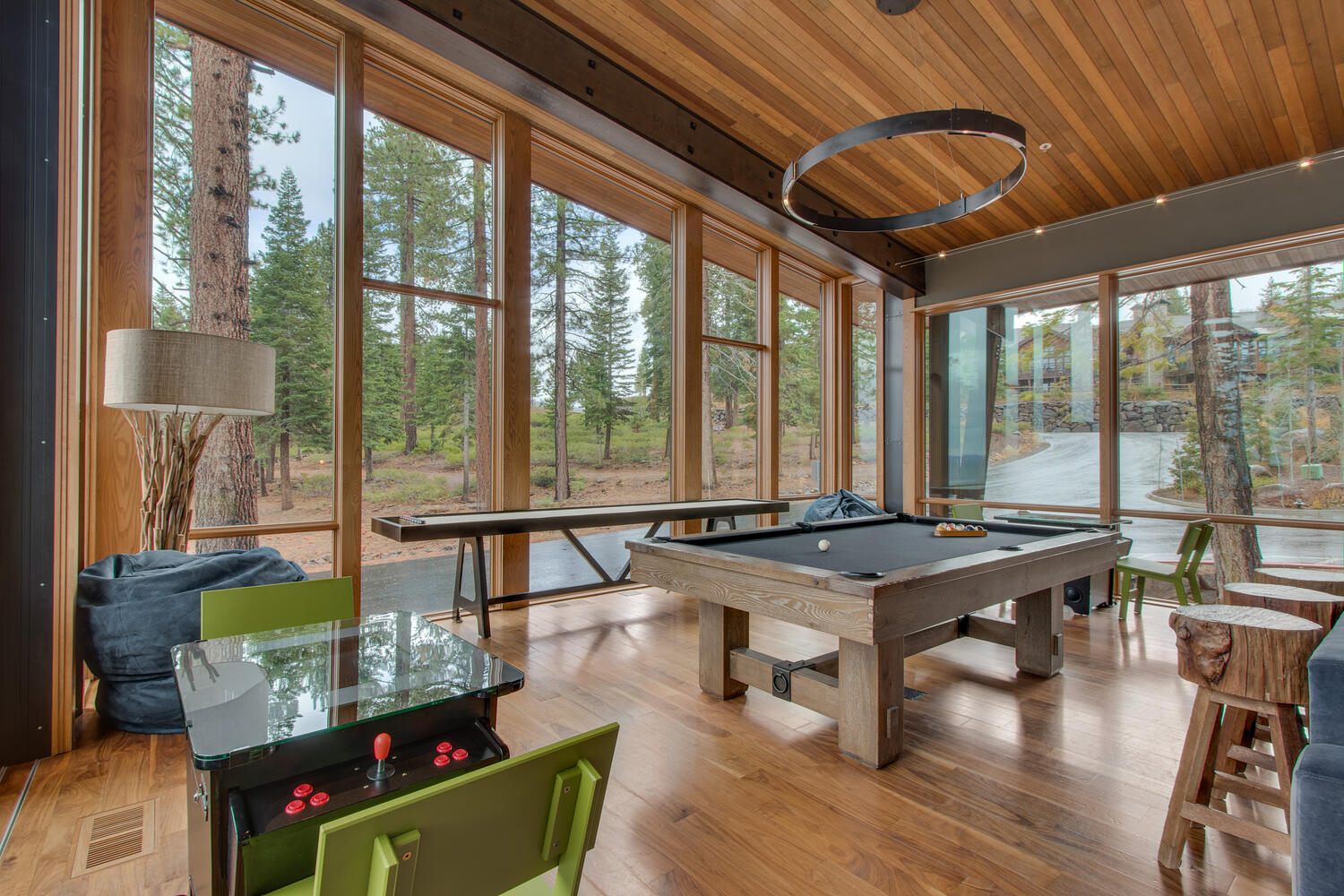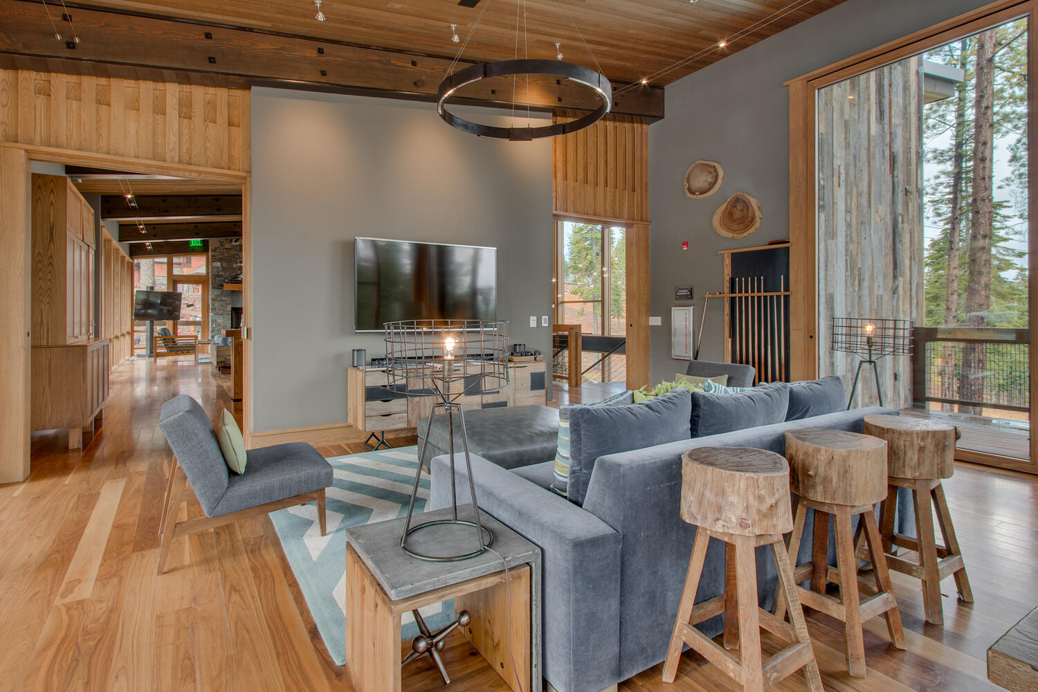 Step inside the home to find an open-concept main level that’s ideal for gathering. The kitchen features two ovens including a warming drawer, wood-paneled refrigerator with two freezer drawers, along with a built-in wine fridge and wet bar for effortless entertaining. A striking stone gas fireplace anchors the great room, while cathedral ceilings and large windows frame the surrounding pines and fill the space with natural light.
