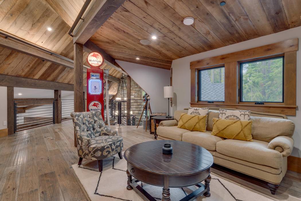 Completed in 2020, this home features endless unique components, such as a hanging staircase made out of forged steel, the use of reclaimed wood from the original Tahoe Tavern pier that was used for multiple pieces throughout the home, a custom A-symmetrical front gate, a 20' stone, floor-to-ceiling, double-sided fireplace centered in the great room, and much more.