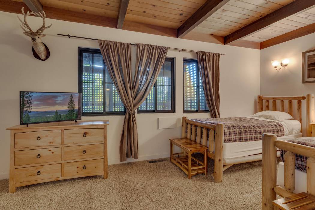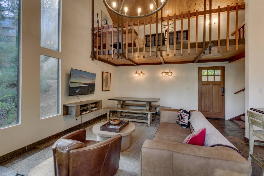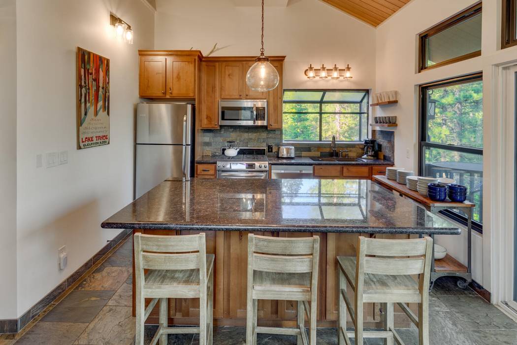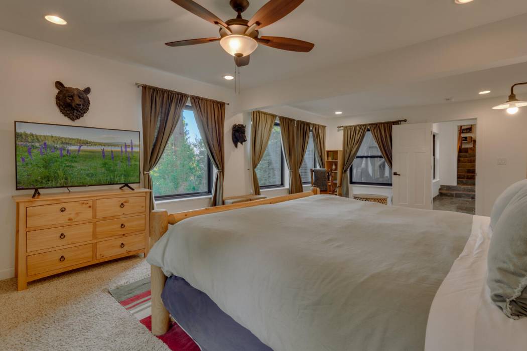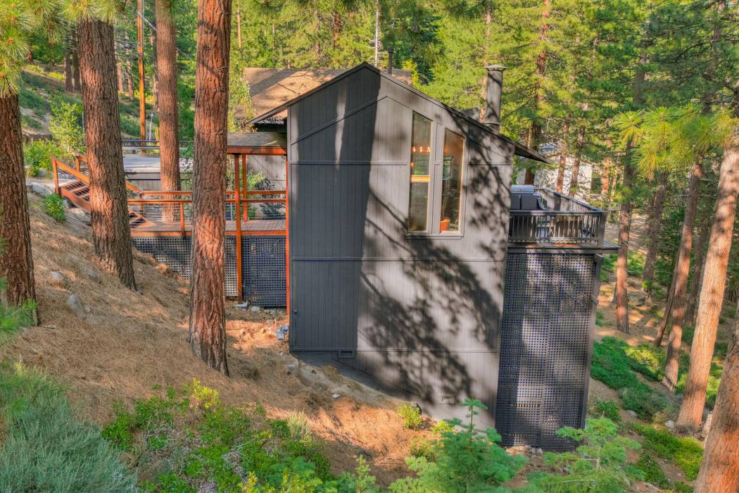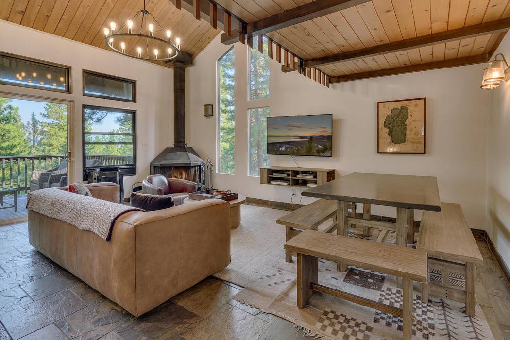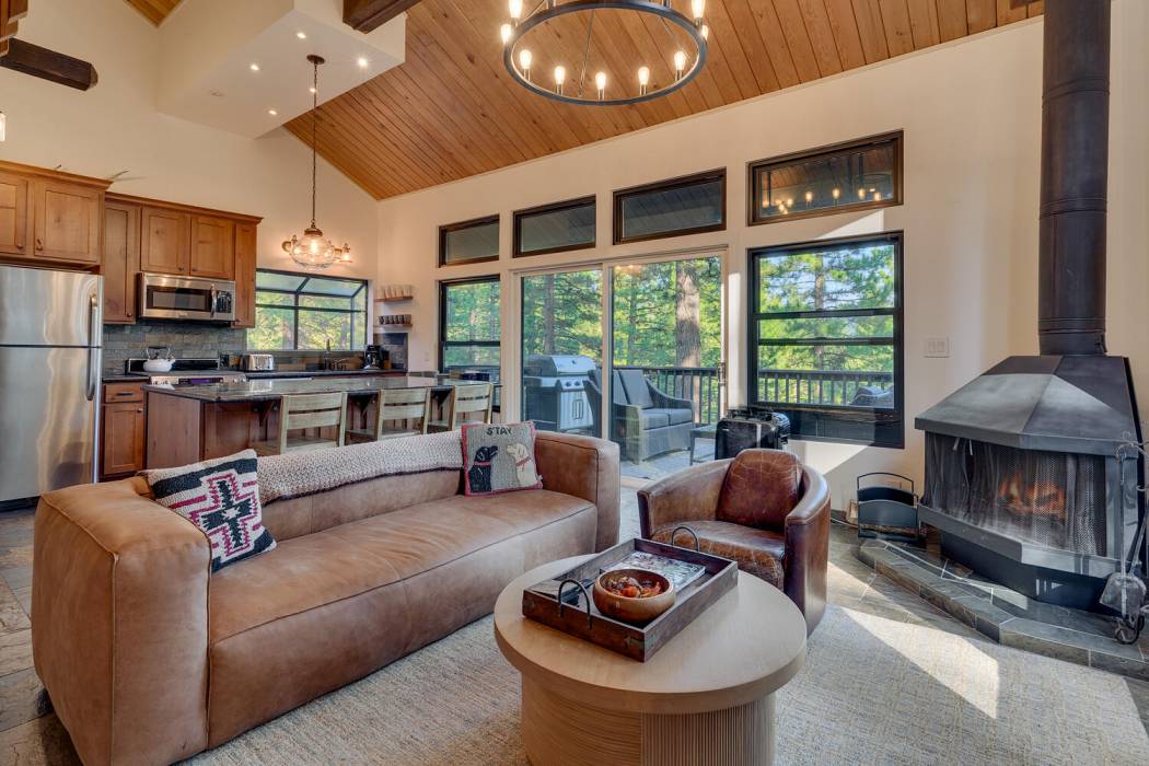 The open-concept living area features vaulted ceilings, a cozy fireplace, and large windows that frame the natural surroundings. The kitchen has been tastefully upgraded with quality finishes and modern appliances, while the bedrooms and baths offer a clean, refreshed aesthetic that still honors the home’s rustic charm. On its own level for privacy, the spacious primary suite looks over the towering pines. Two-car attached garage and large mud room provides easy year-round access and ample room for gear, tools, and Tahoe toys.
