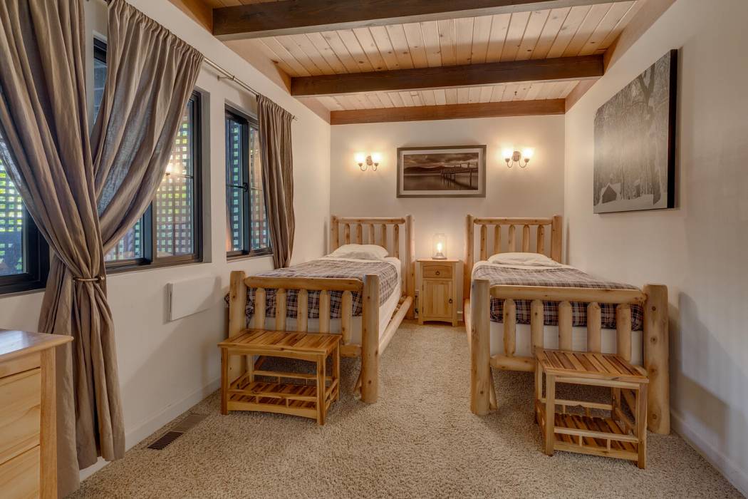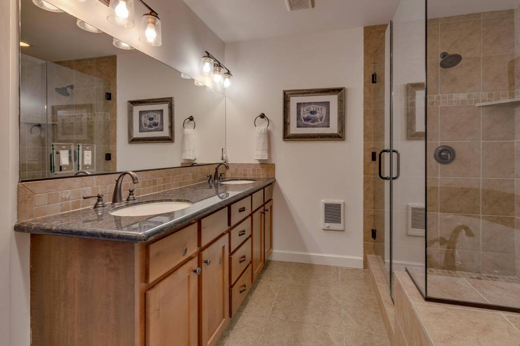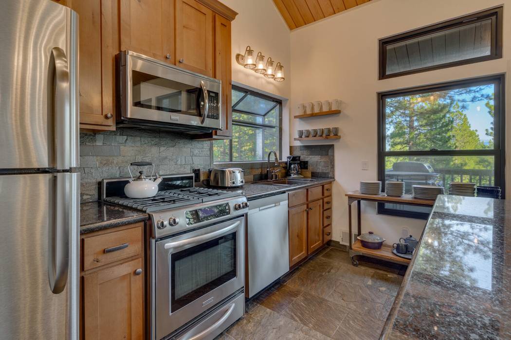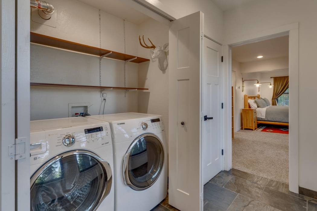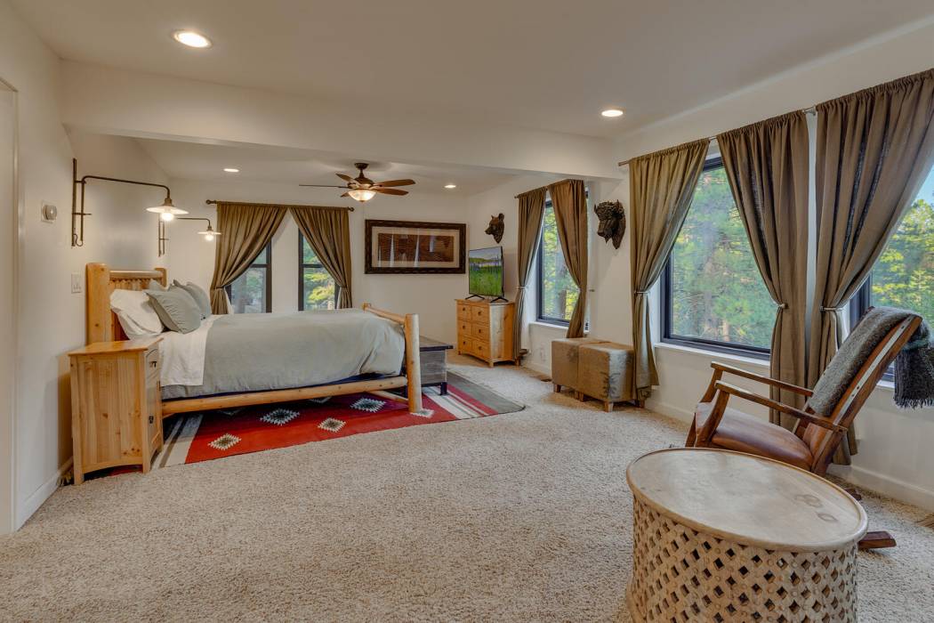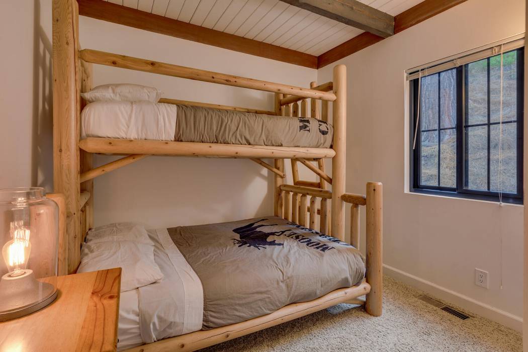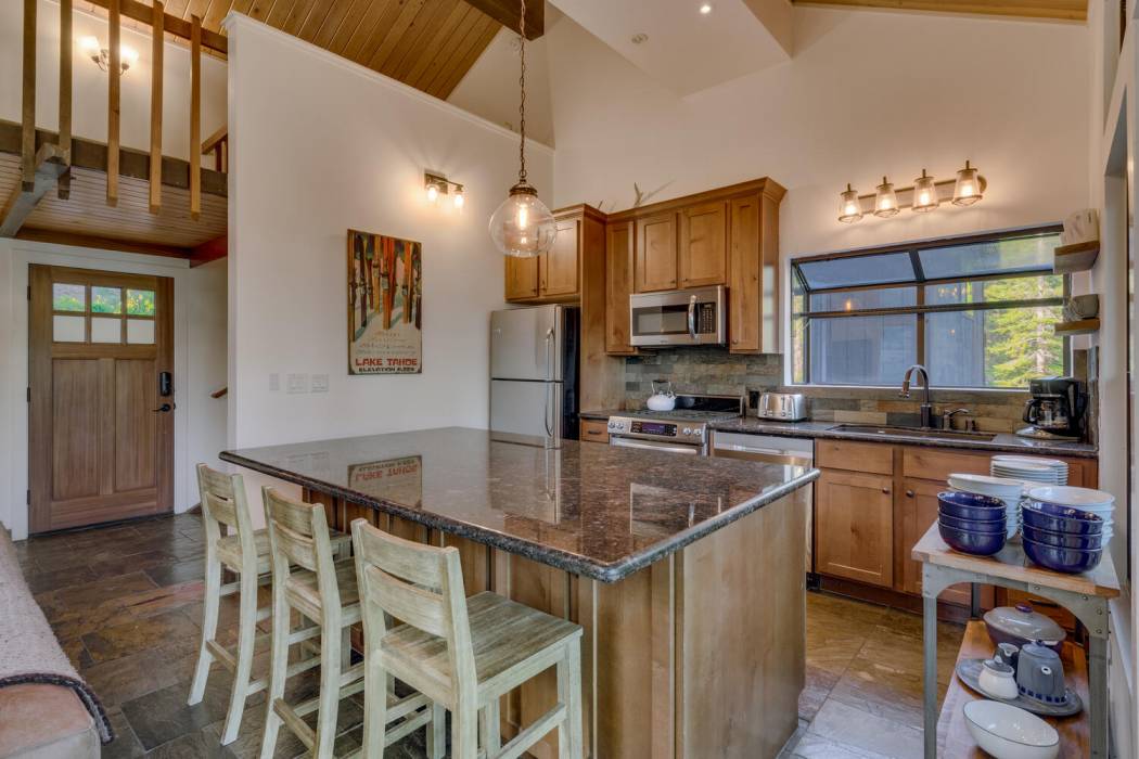 The open-concept living area features vaulted ceilings, a cozy fireplace, and large windows that frame the natural surroundings. The kitchen has been tastefully upgraded with quality finishes and modern appliances, while the bedrooms and baths offer a clean, refreshed aesthetic that still honors the home’s rustic charm. On its own level for privacy, the spacious primary suite looks over the towering pines. Two-car attached garage and large mud room provides easy year-round access and ample room for gear, tools, and Tahoe toys.
